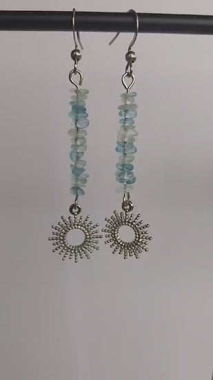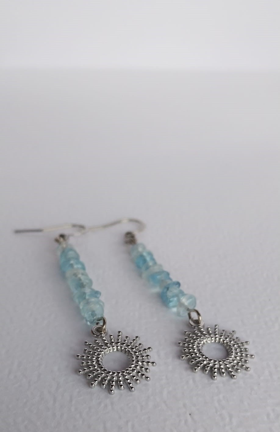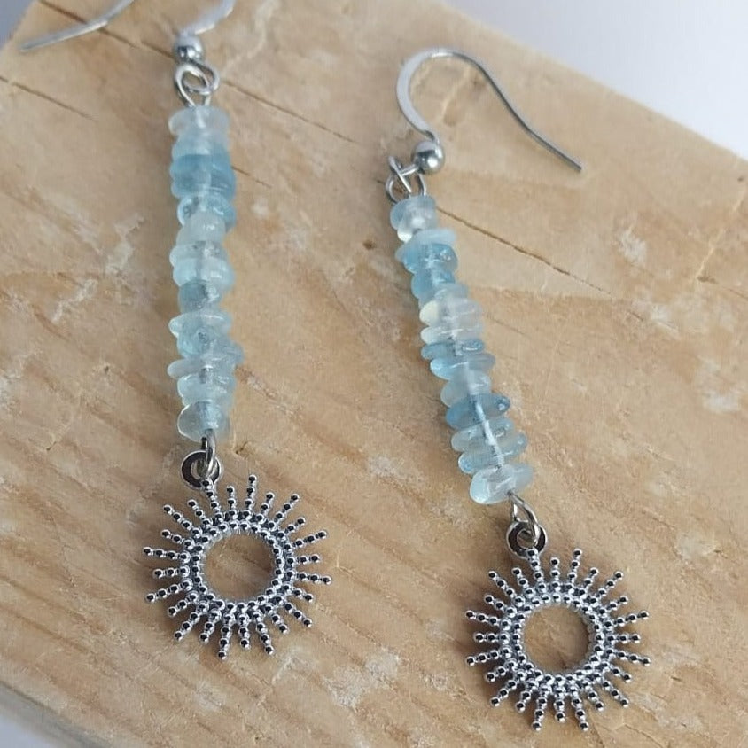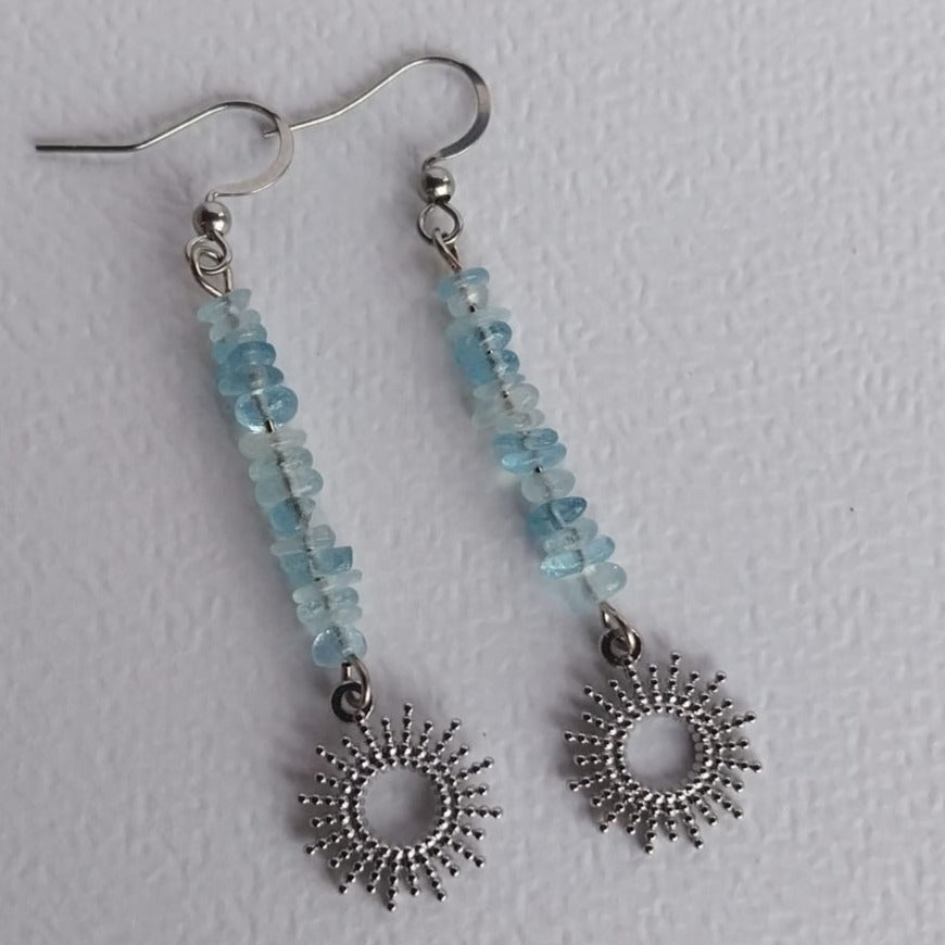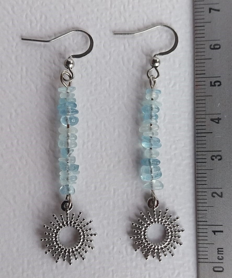 Boucles d'oreilles aigue-marine couleur bleu ciel et translucide. Breloque petit soleil couleur argent. Crochets, anneaux et breloque en acier inoxydable couleur rhodium.