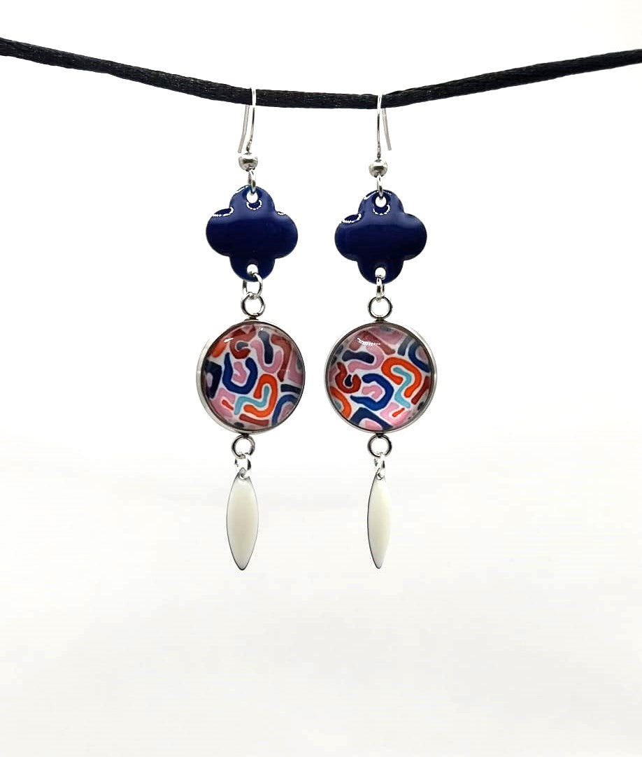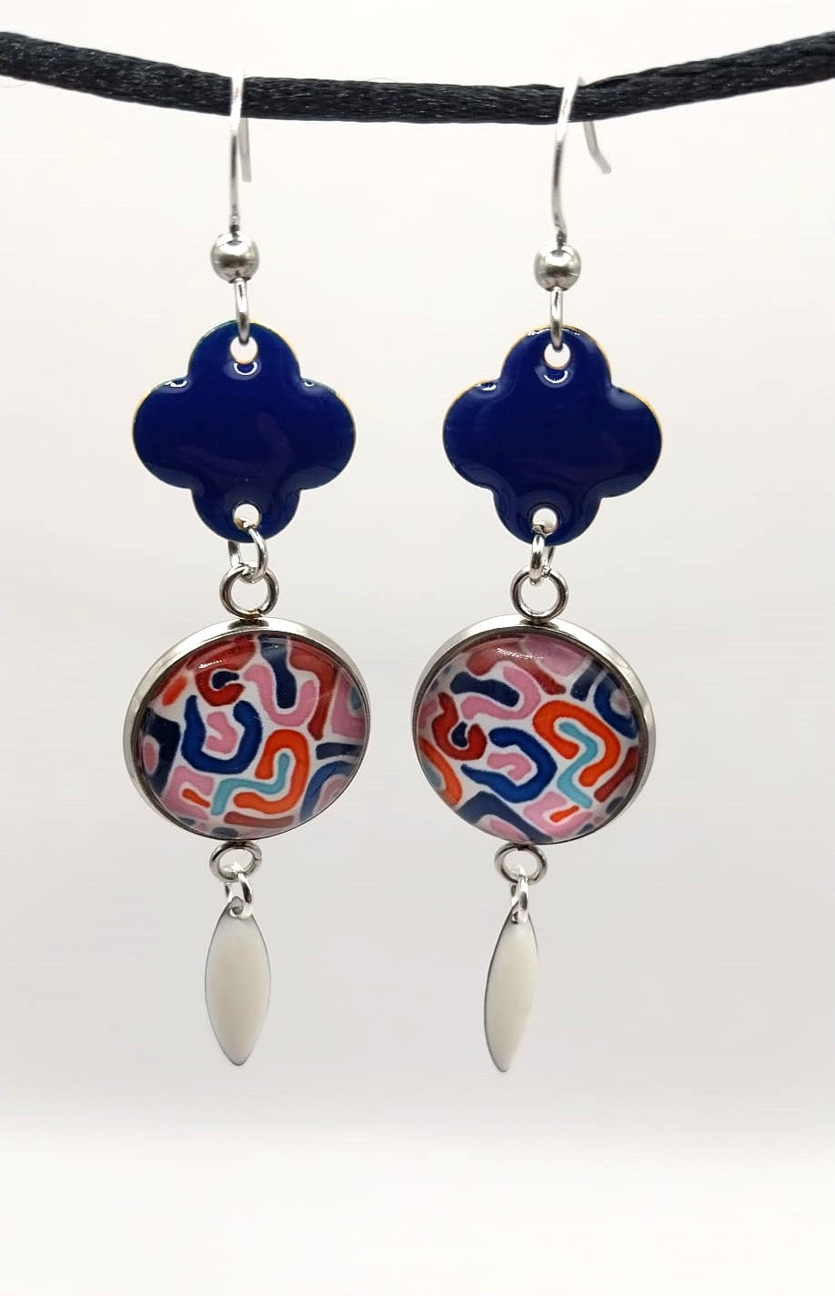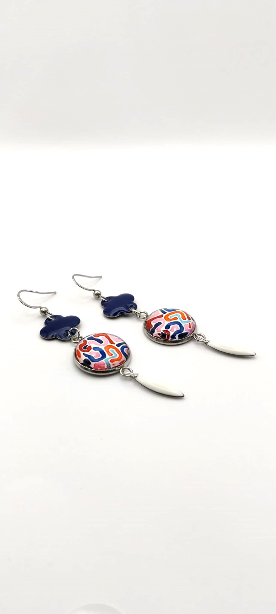 Boucles d'oreille avec cabochons multicolores et breloques émaillées bleu et blanc