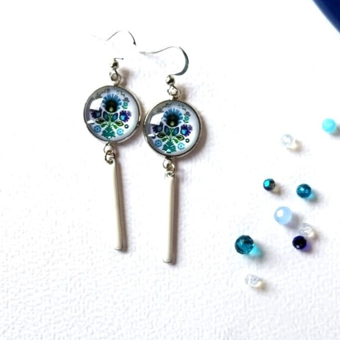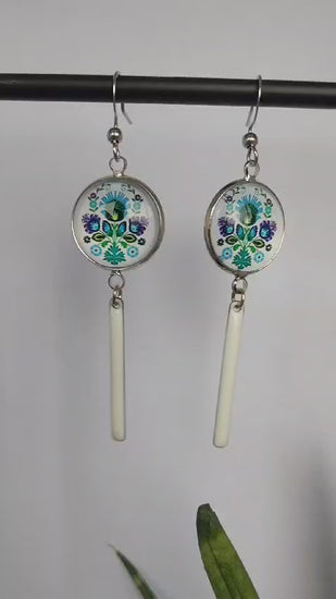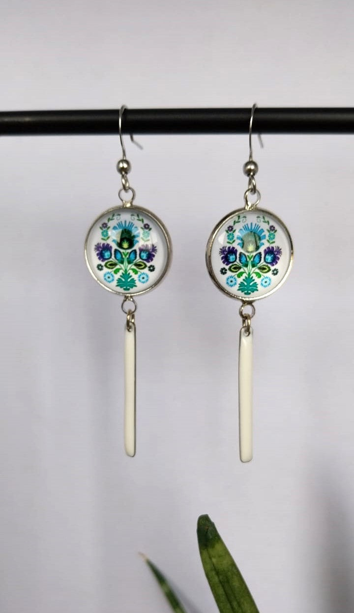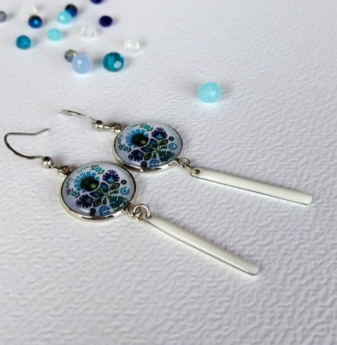 Boucles d'oreilles avec cabochons de 16 mm de diamètre, réalisés à la main. Les fleurs sont d'inspiration traditionnelle polonaise. Les breloques blanches sont émaillées sur les deux faces et mesurent 28 x 3 mm. Dimension totale : environ 60 mm.