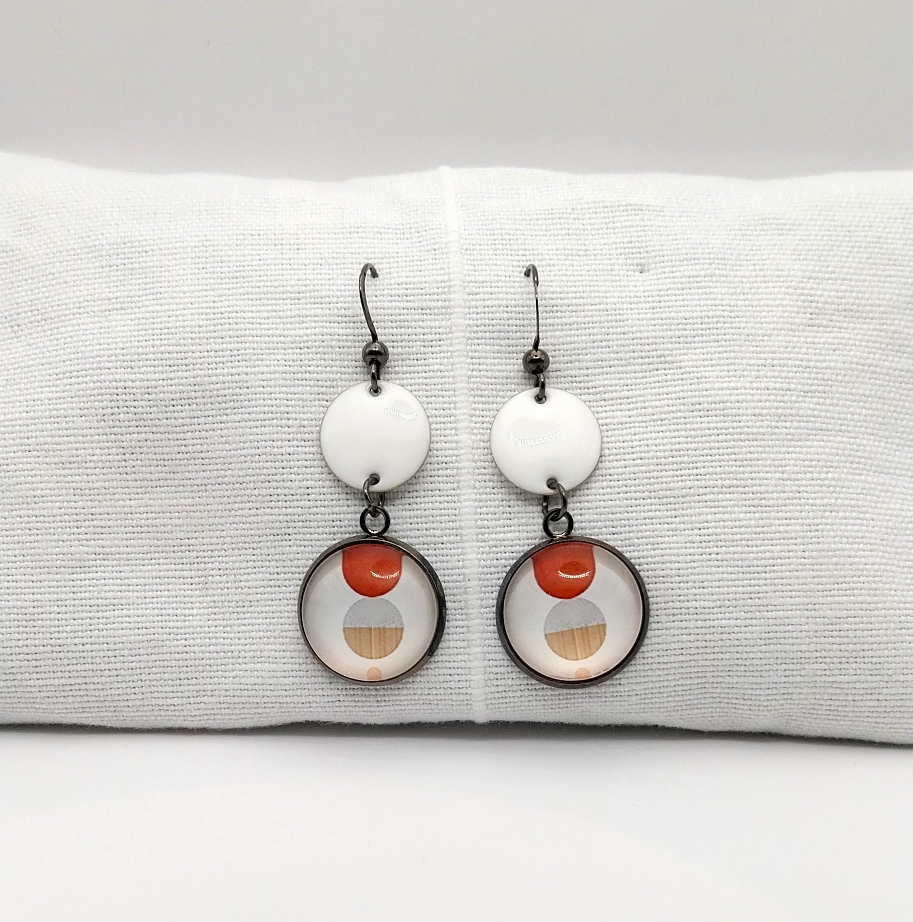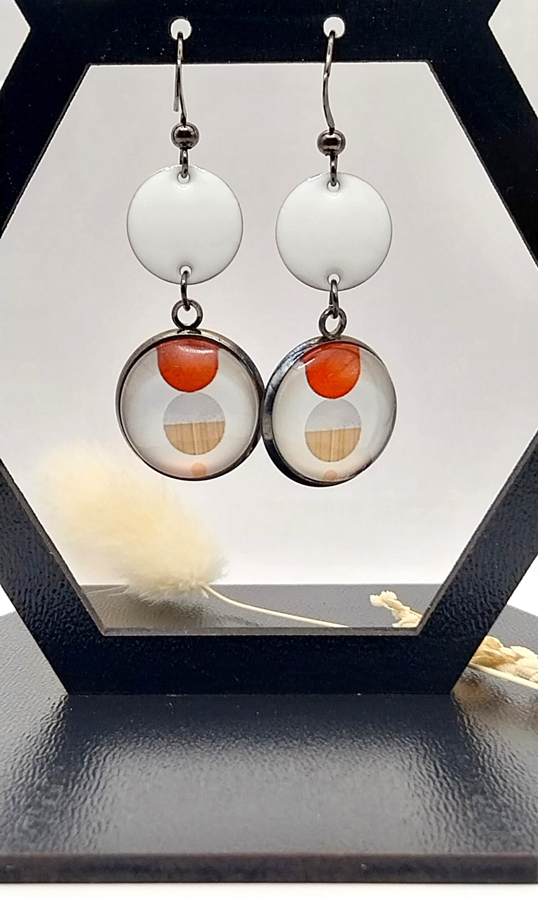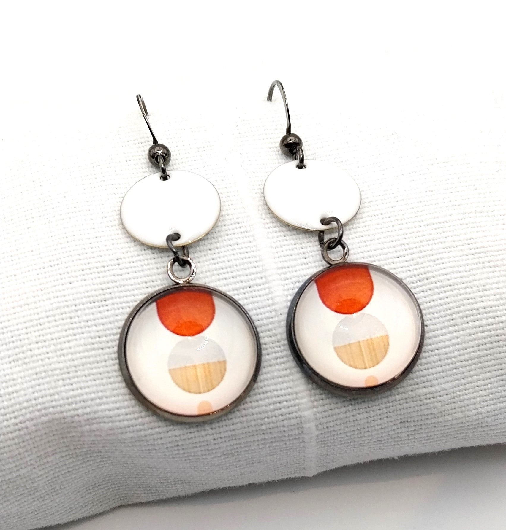 Boucles d'oreille cabochon graphique orangé et breloque émaillée