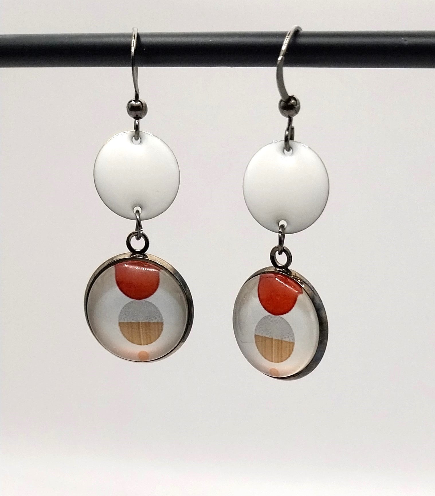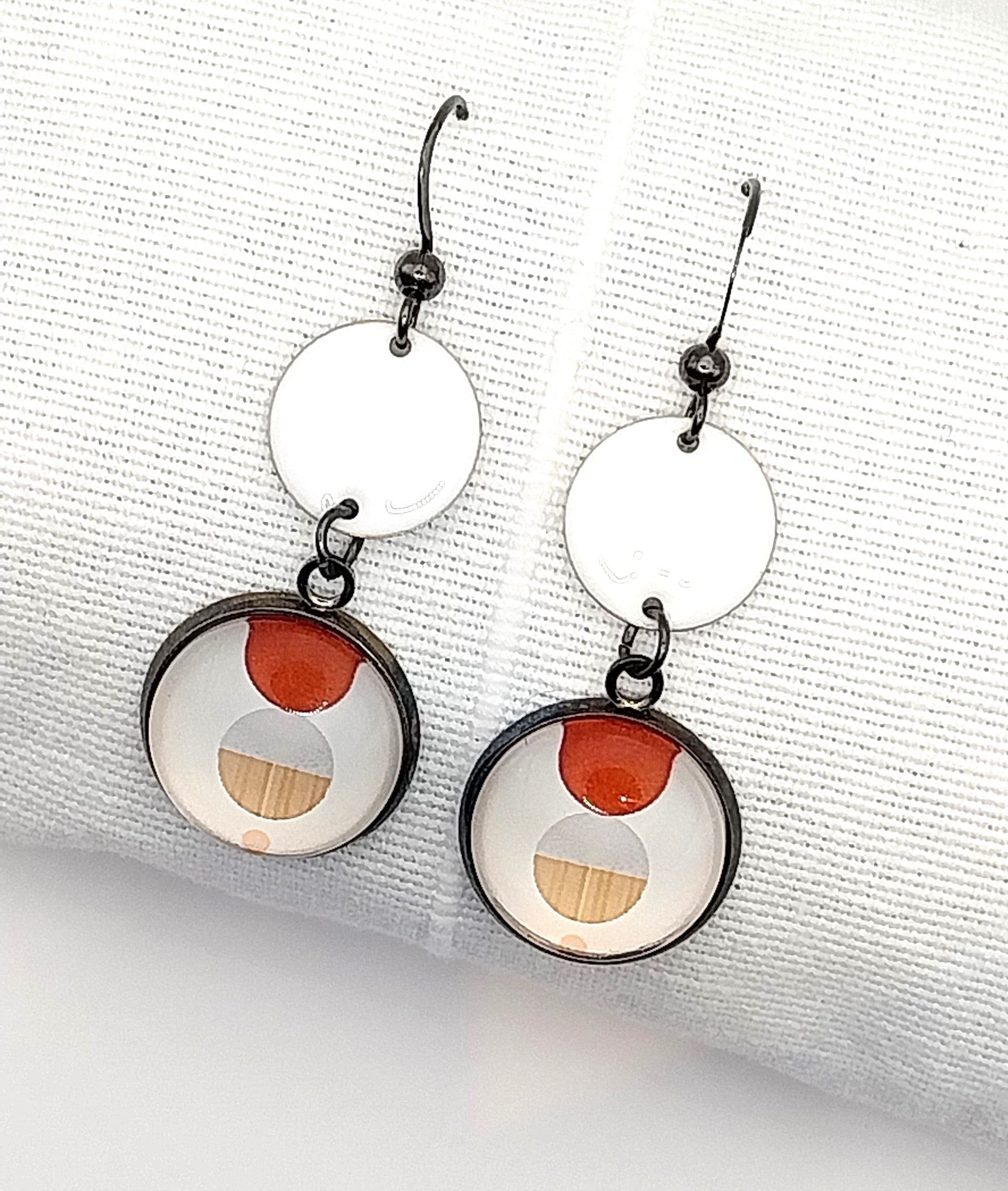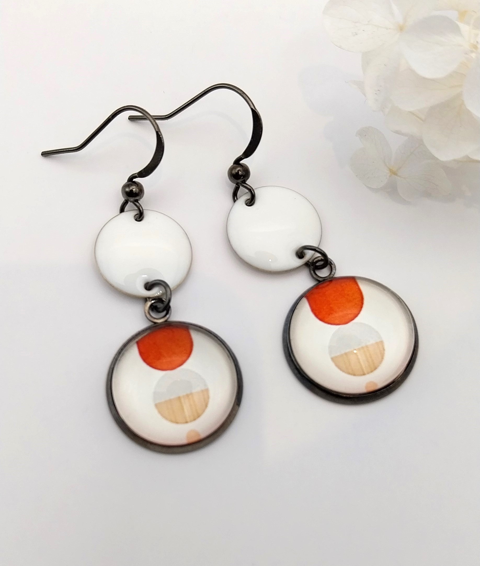 Boucles d'oreille cabochon graphique orangé et breloque émaillée