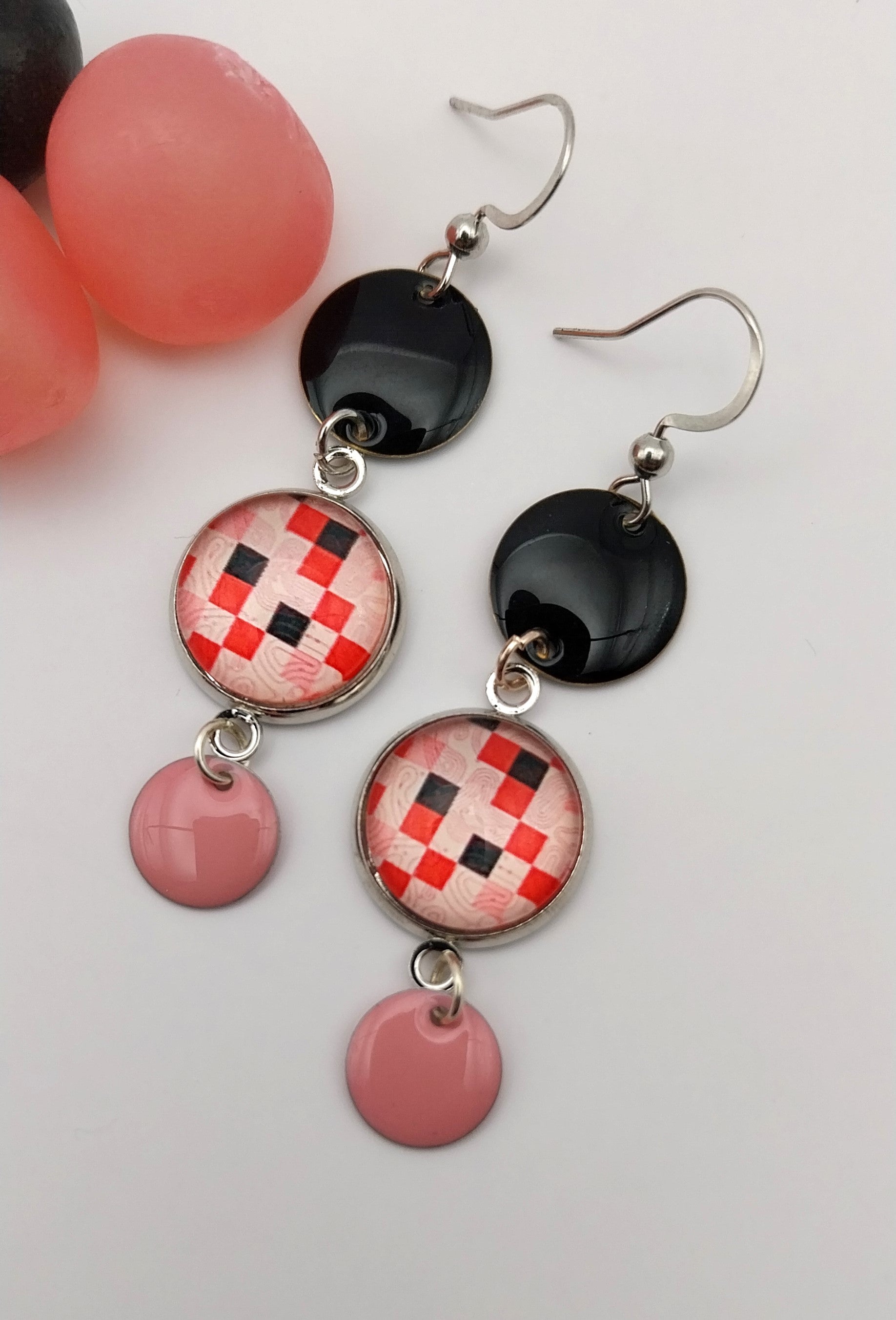 Boucles d'oreille cabochons graphiquse et breloques émaillées roses et noires