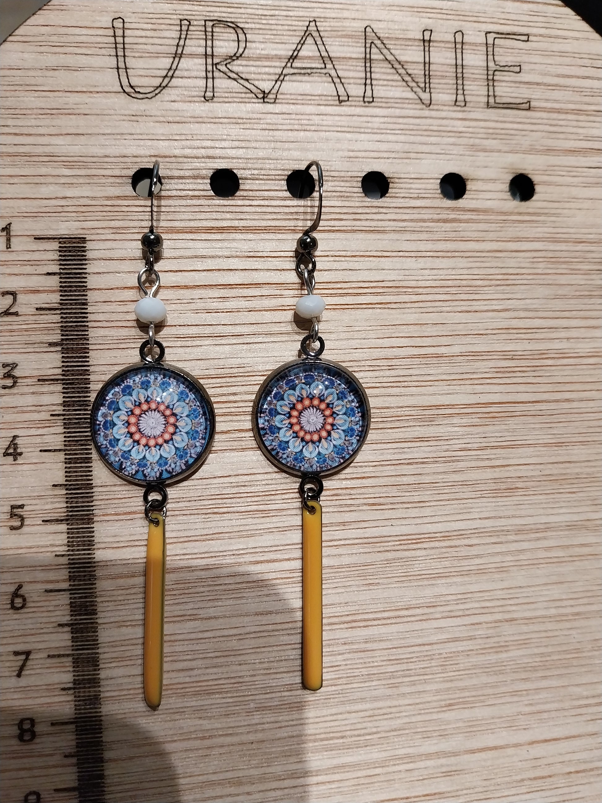 Boucles d'oreille mandala bleu et breloque en émail jaune orangé.