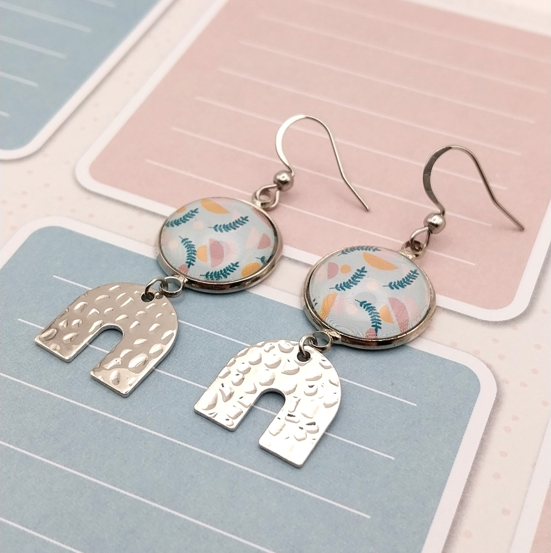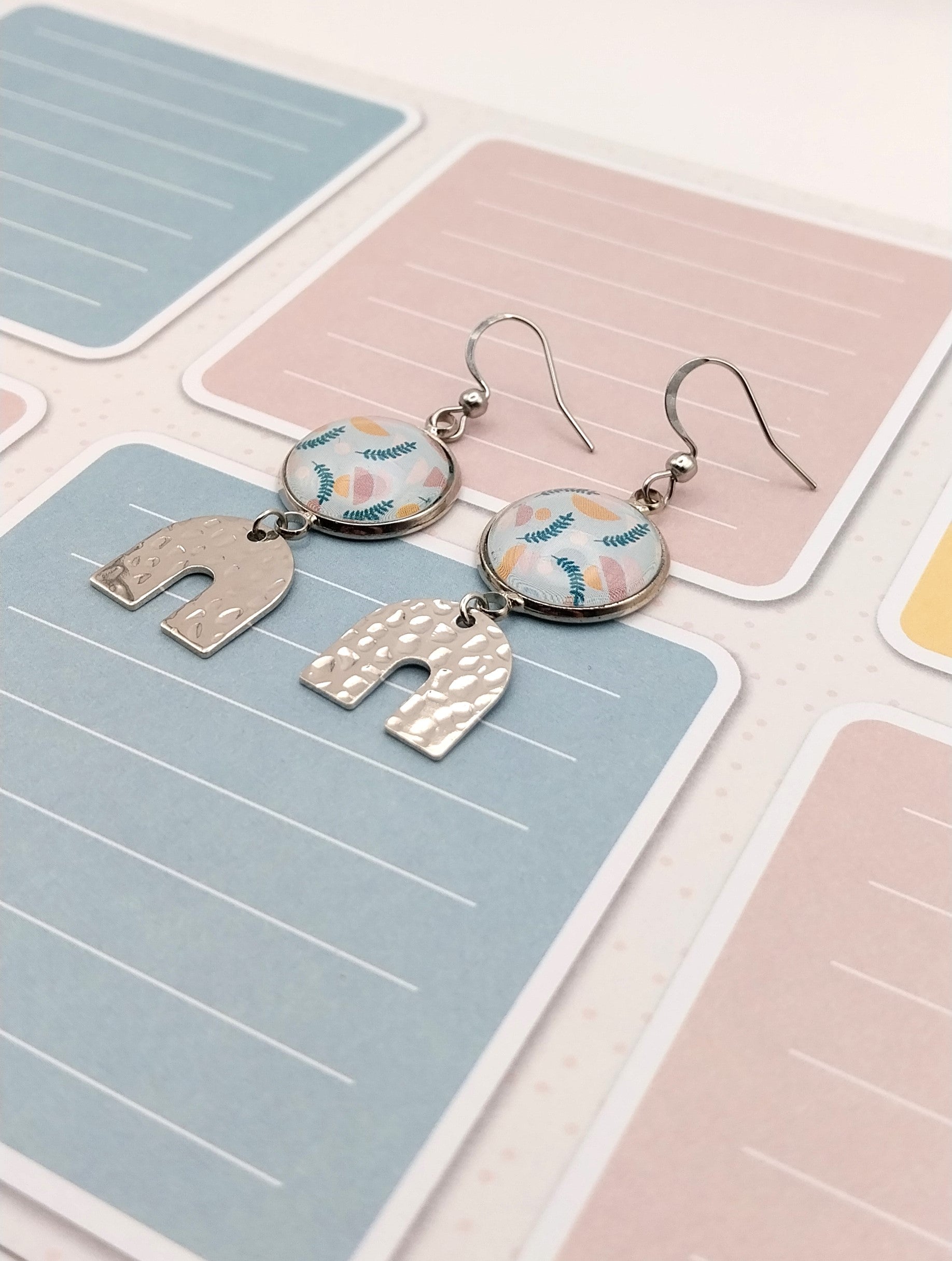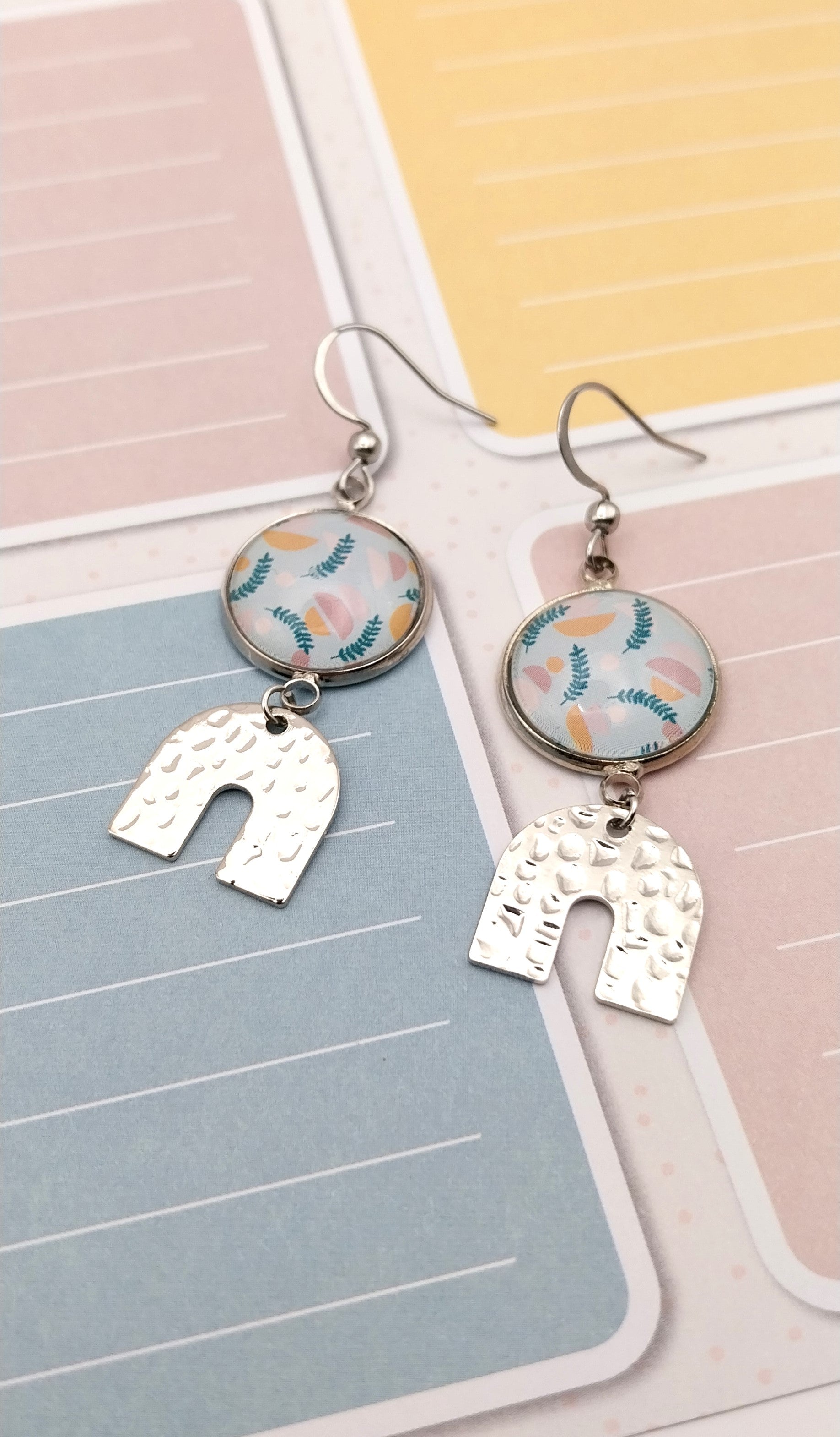 Boucles d'oreille avec cabochons de 14 mm motif pastel. La breloque en forme de U et les apprêts sont en acier inoxydable et hypoallergénique.