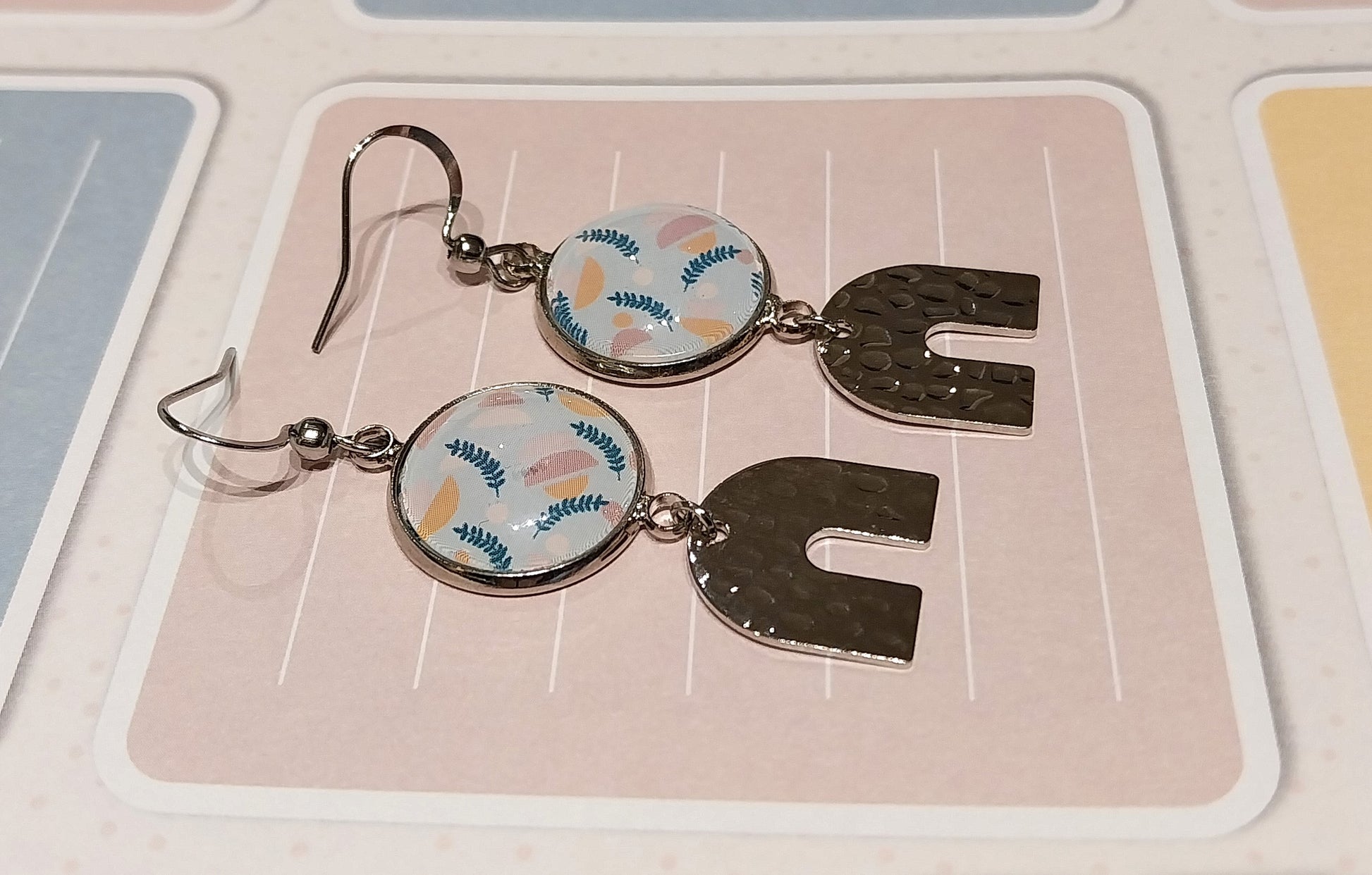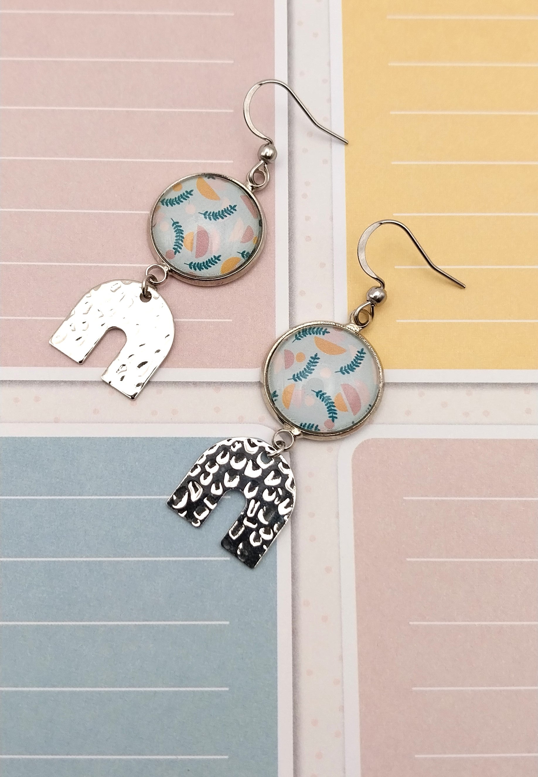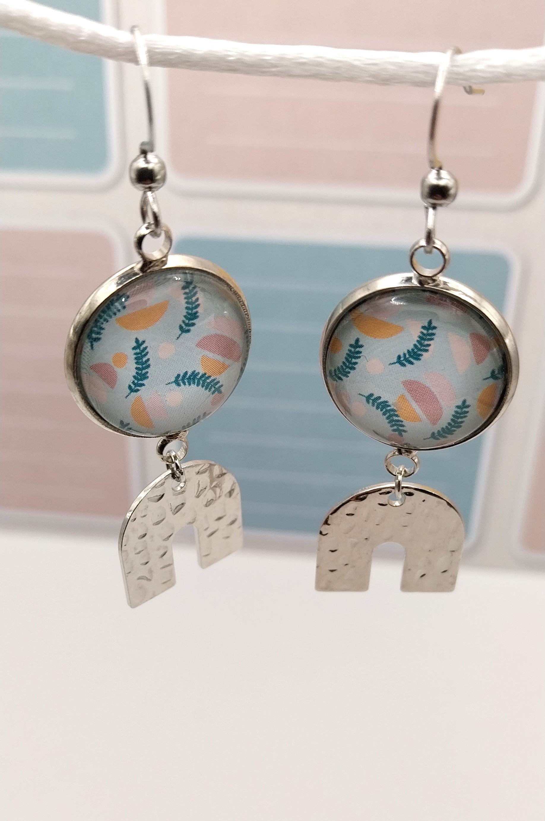 Boucles d'oreille avec cabochons de 14 mm motif pastel. La breloque en forme de U et les apprêts sont en acier inoxydable et hypoallergénique.