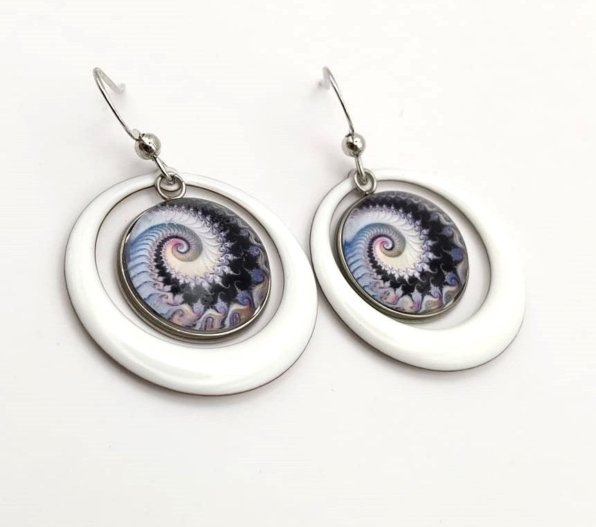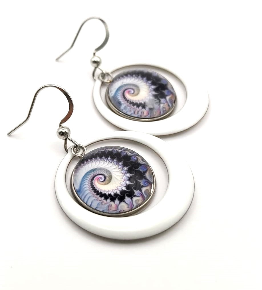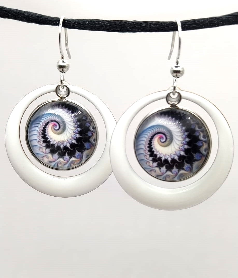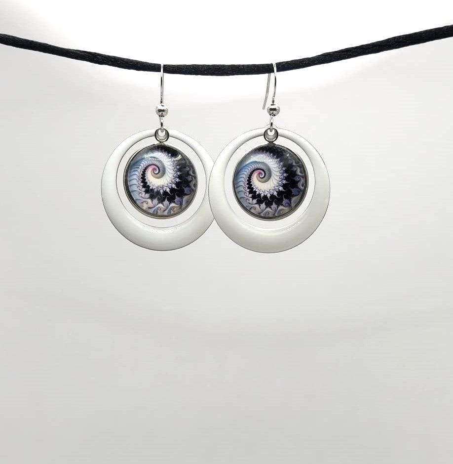 Boucles d'oreille avec cabochons de 16 mm avec spirales fractales et breloques créoles en émail blanc de 28 mm. Elles sont très légères à porter.