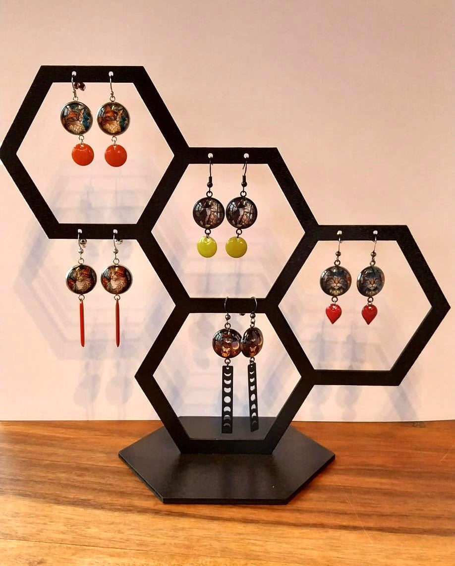 Crochets et anneaux couleur gun métal. Fermoirs fournis. Légères à porter. Modèle unique.