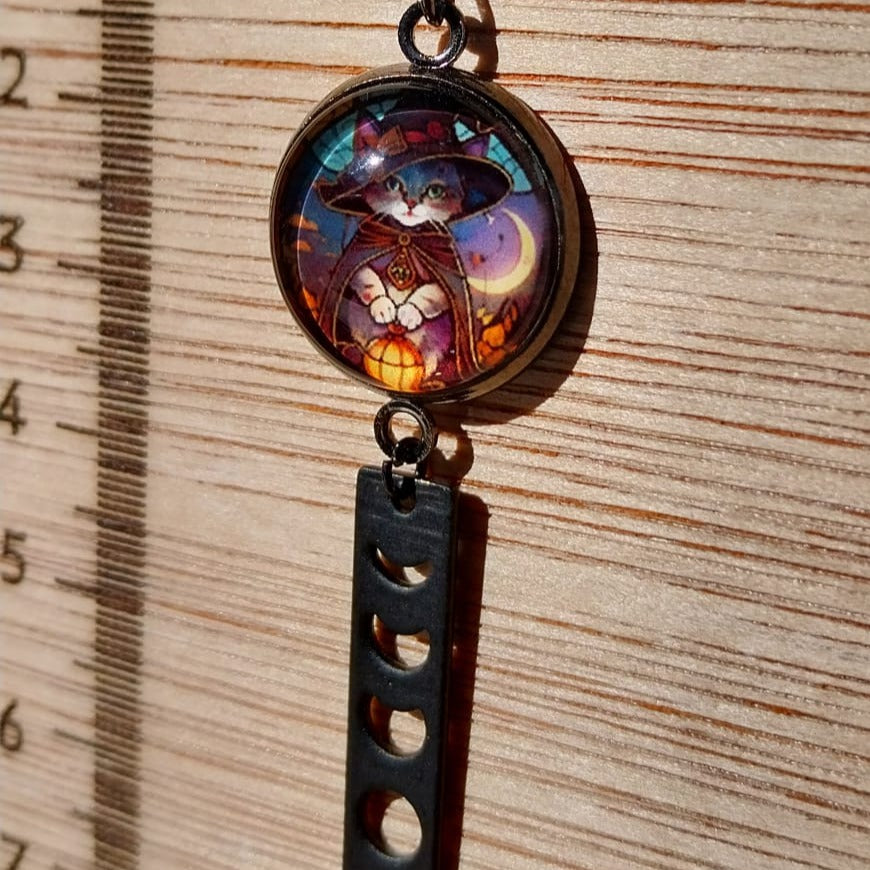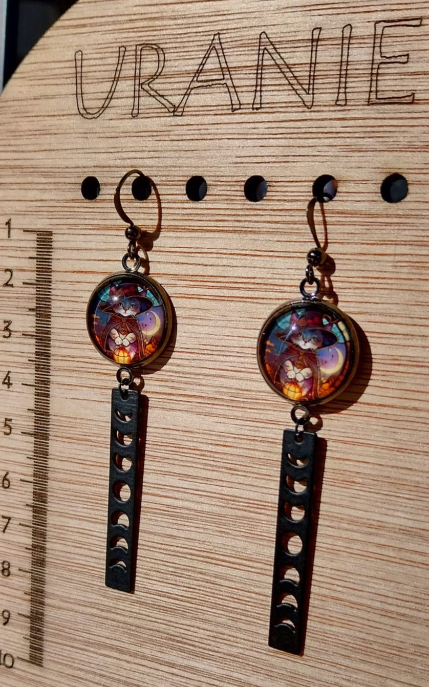 Boucles d'oreilles pendantes cabochons chat mystérieux et breloque émaillée sur les deux faces goutte carmin. Cabochons de 16 mm. Longueur totale : 78 mm.