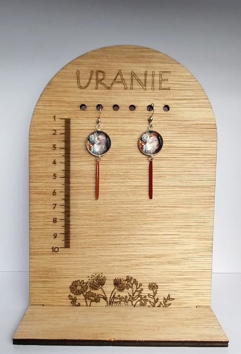 Boucles d'oreilles pendantes cabochons chat pensif et breloque rouge émaillée sur les deux faces. Cabochons de 16 mm. Longueur totale : 63 mm.