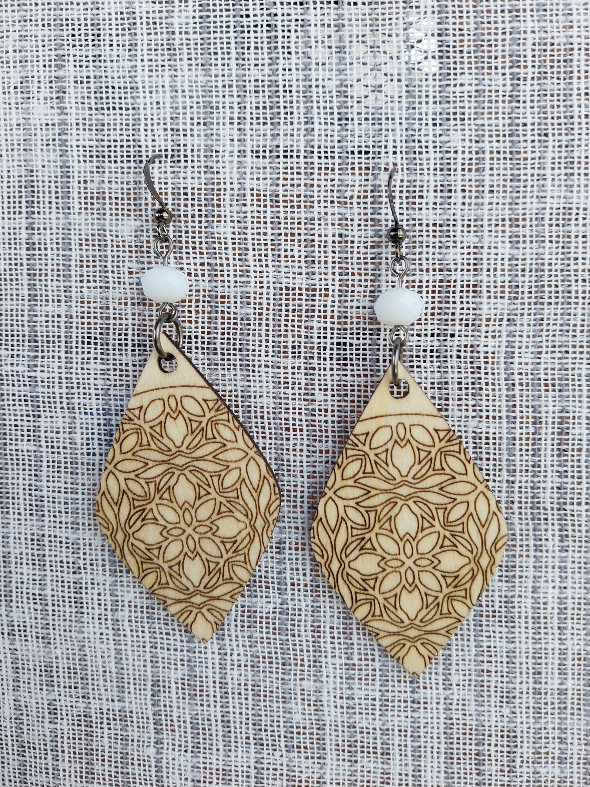 Boucles d'oreille dentelle de bois gravé et perles à facettes blanc laiteux.