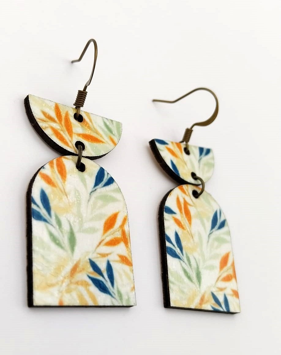 Boucles d'oreille en bois de tilleul imprimé multicolore feuillage d'automne