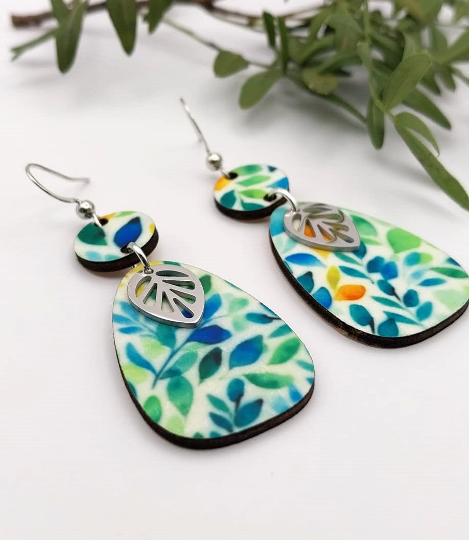Boucles d'oreille en bois de tilleul imprimé multicolore avec breloques en forme de feuille argent brillant. Très légères à porter elles sont conçues grâce à une technique unique comme ce modèle.