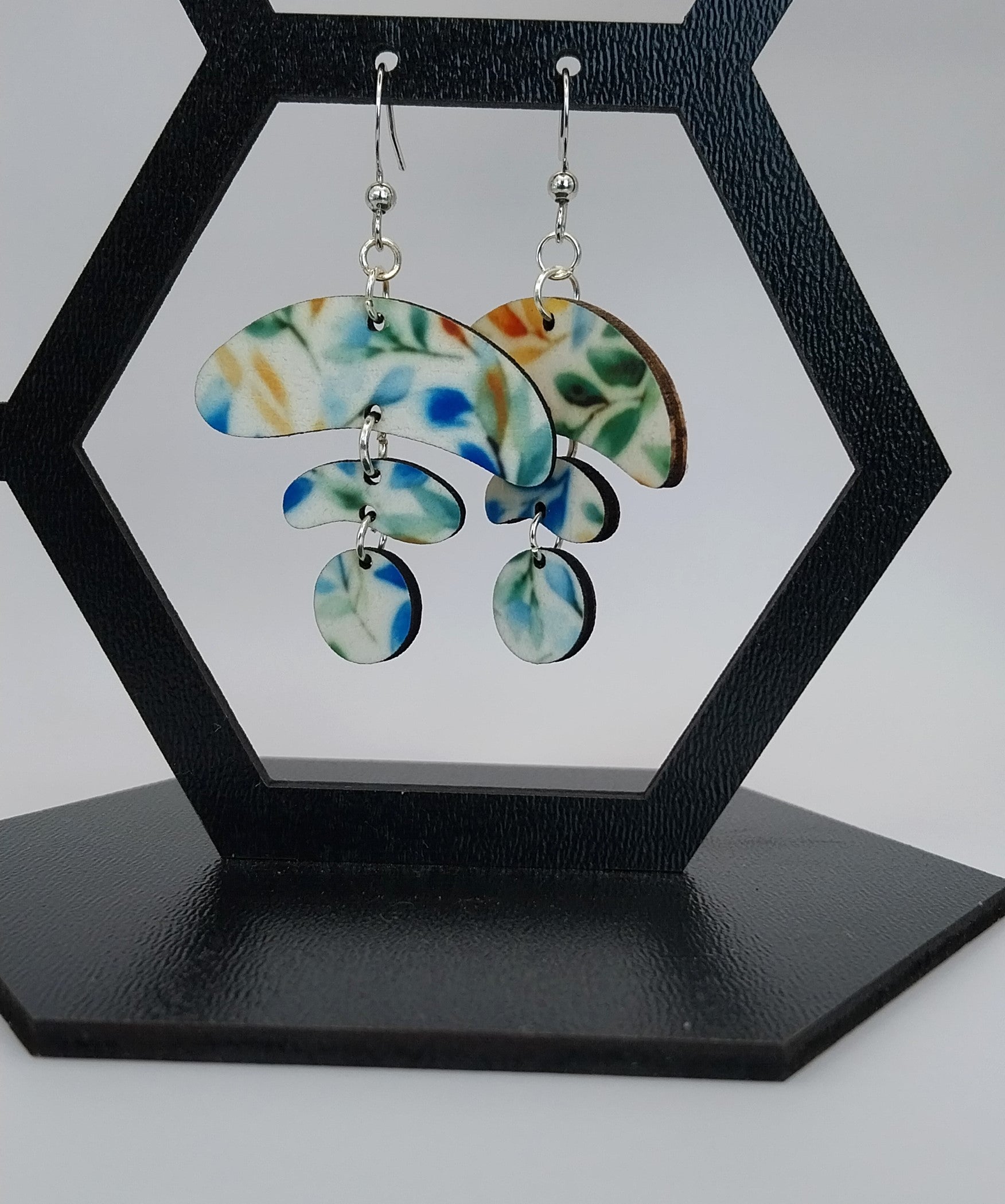 Boucles d'oreilles motif floral aquarelle en bois imprimé grâce à une technique unique comme ce modèle. Elles sont très légères à porter.