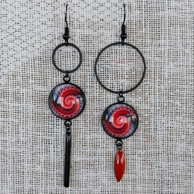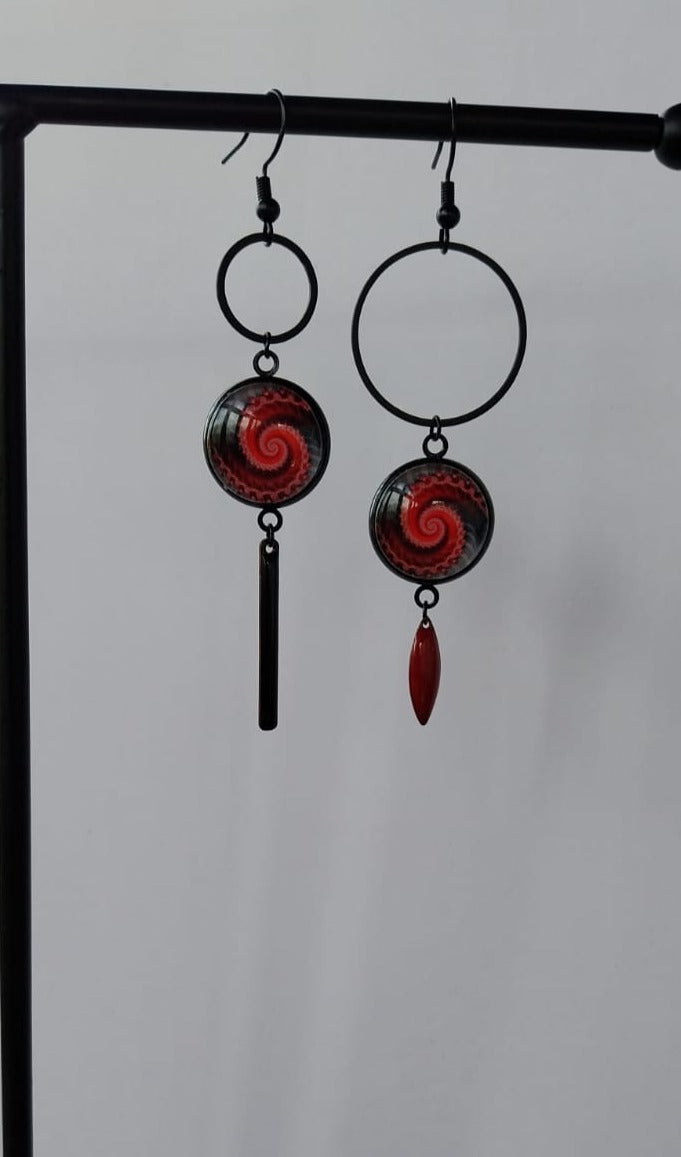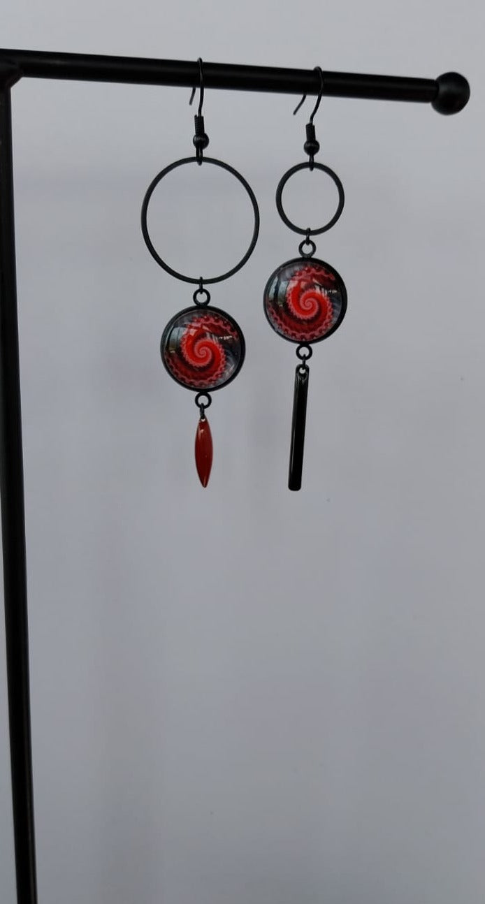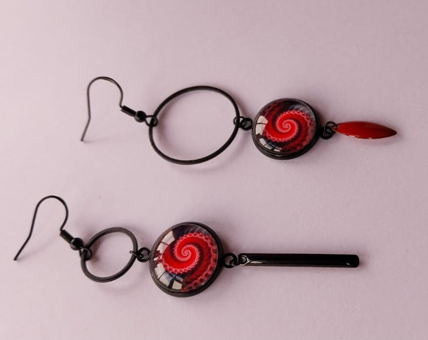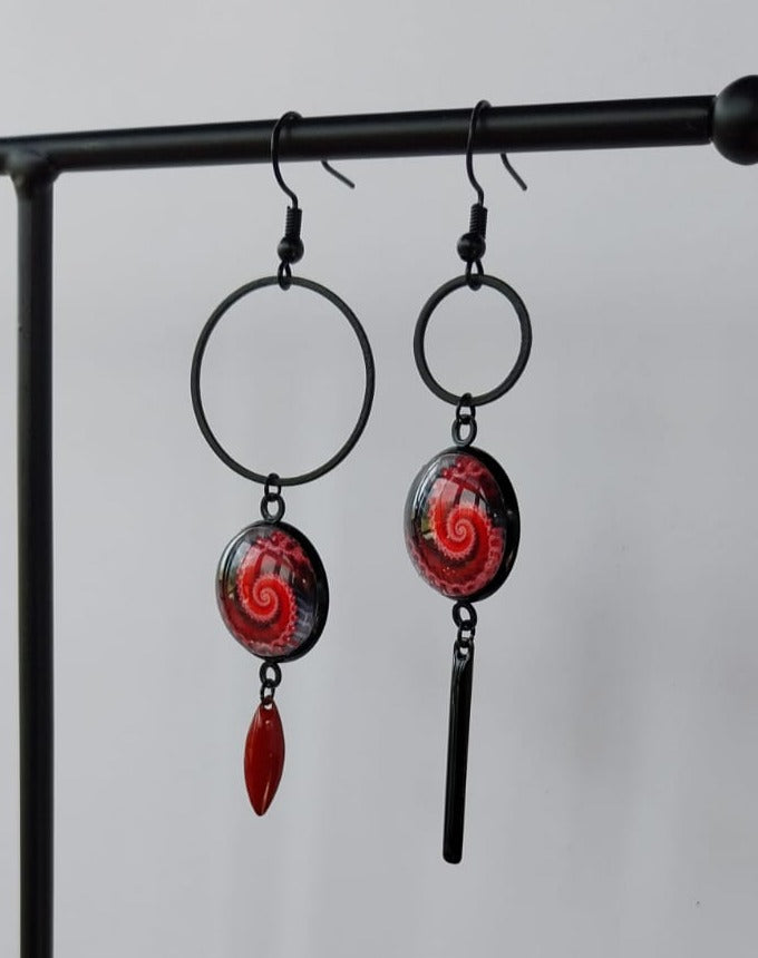 Boucles d'oreille spirales asymétriques rouge et noir