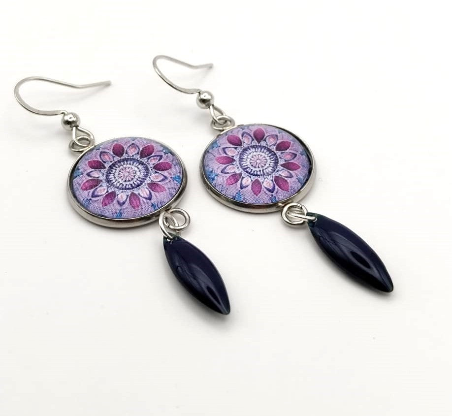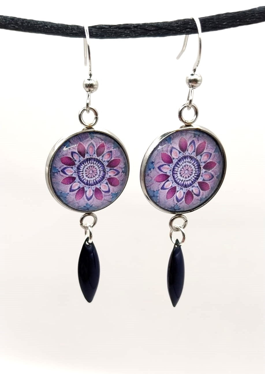 Boucles d'oreilles cabochon mandala mauve et bleu nuit et breloque émaillée