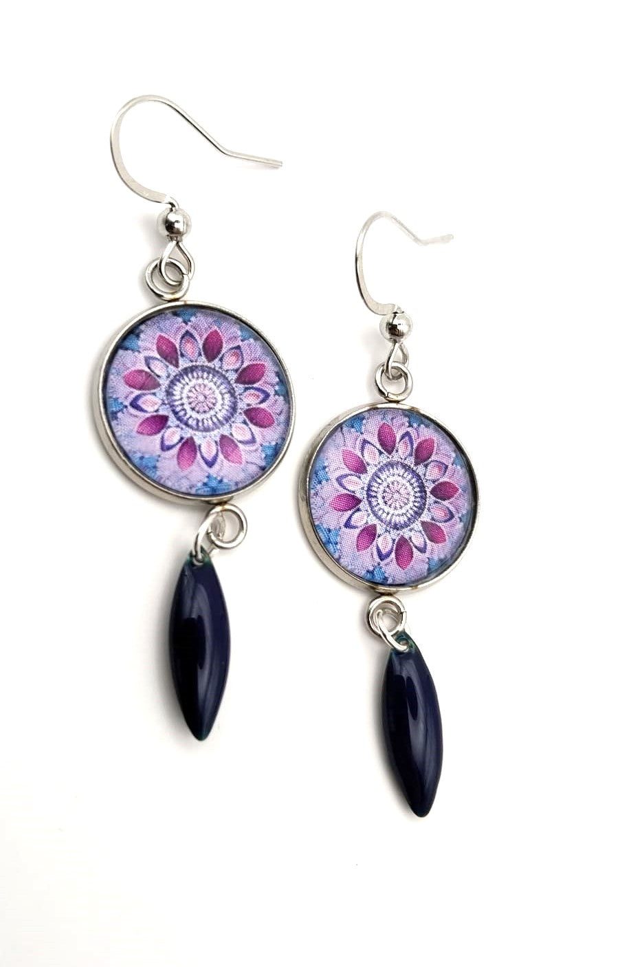 Boucles d'oreilles avec cabochons en verre de 16 mm mandala mauve et bleu et breloque émaillée assorties bleu nuit.