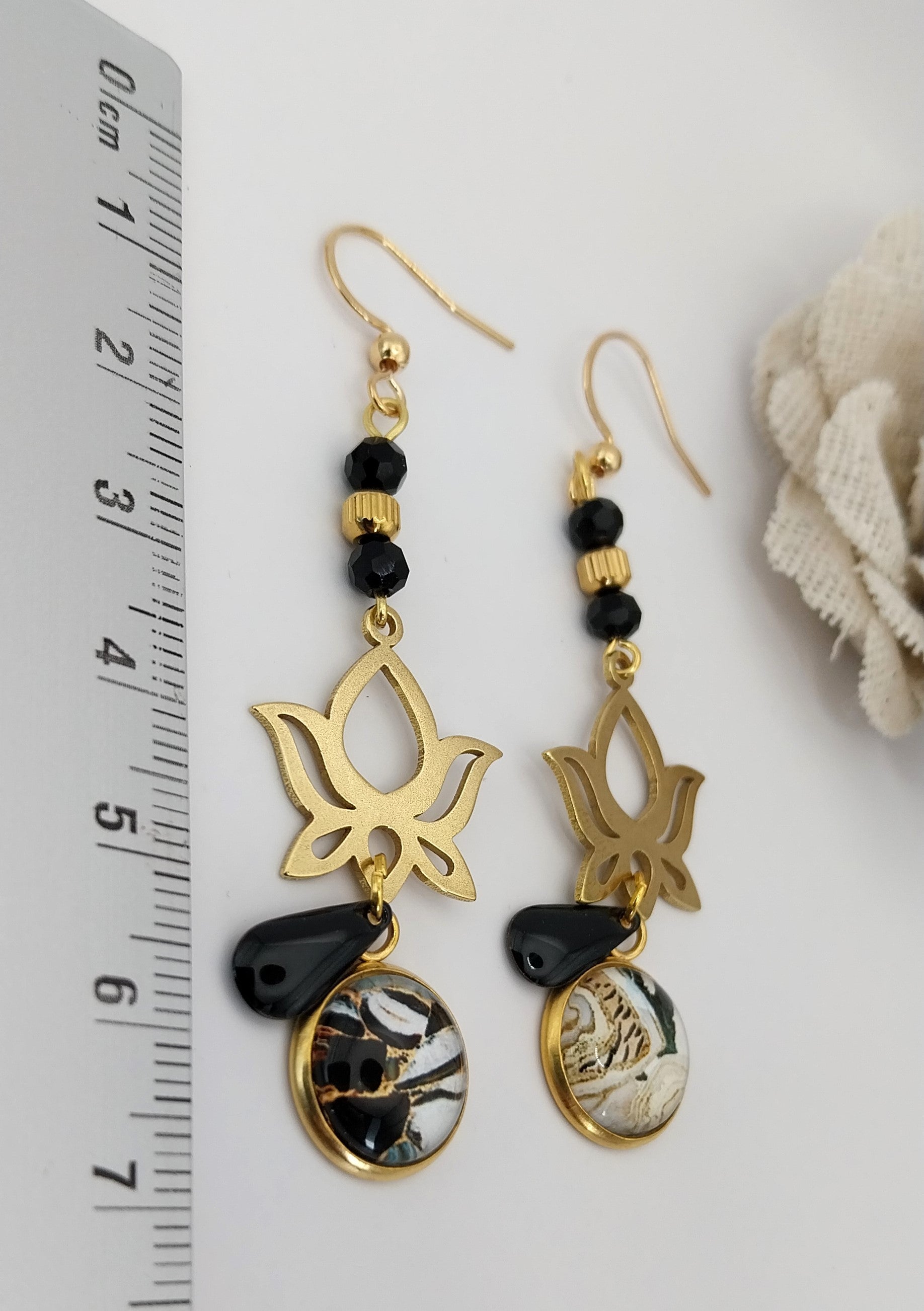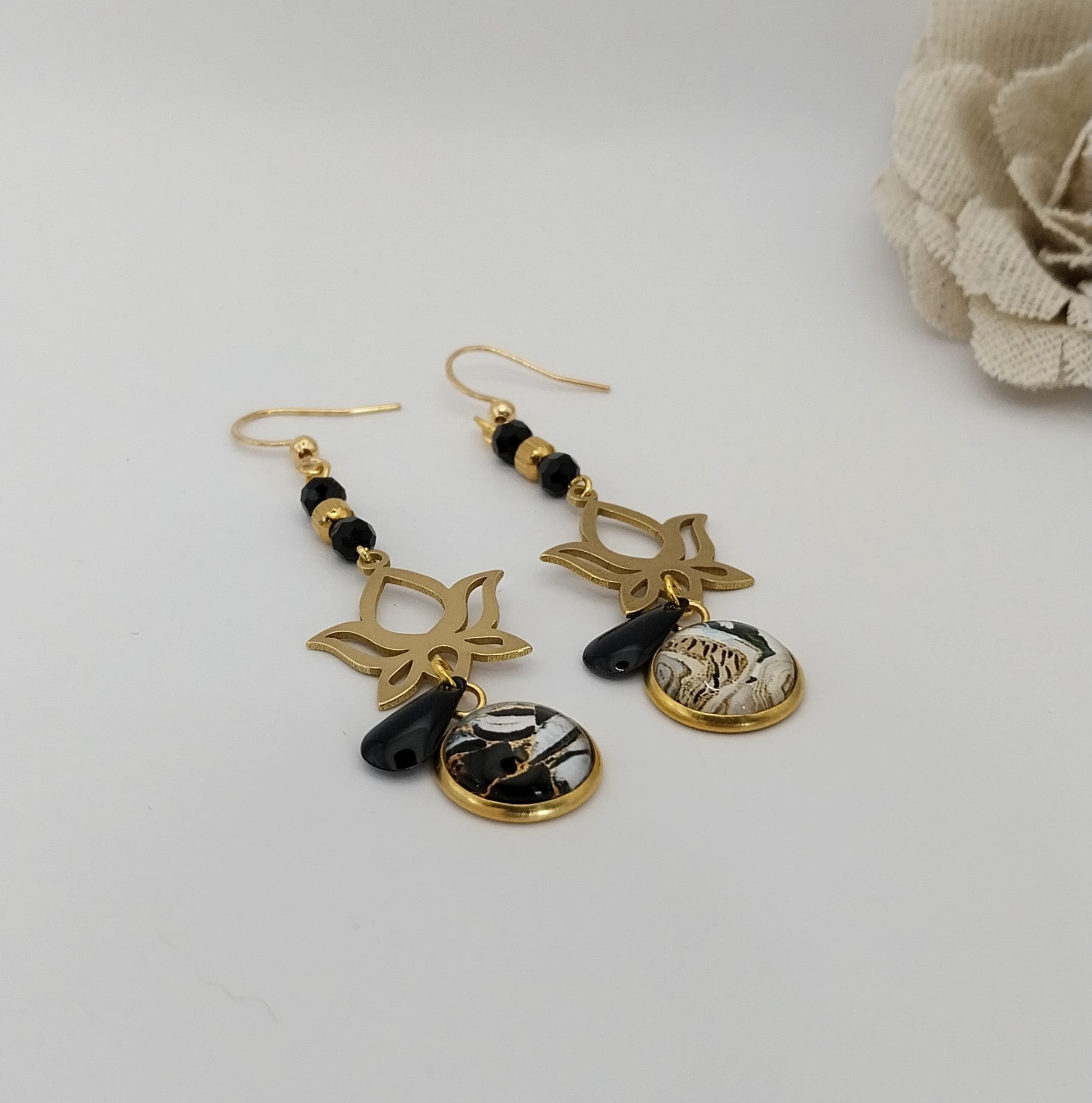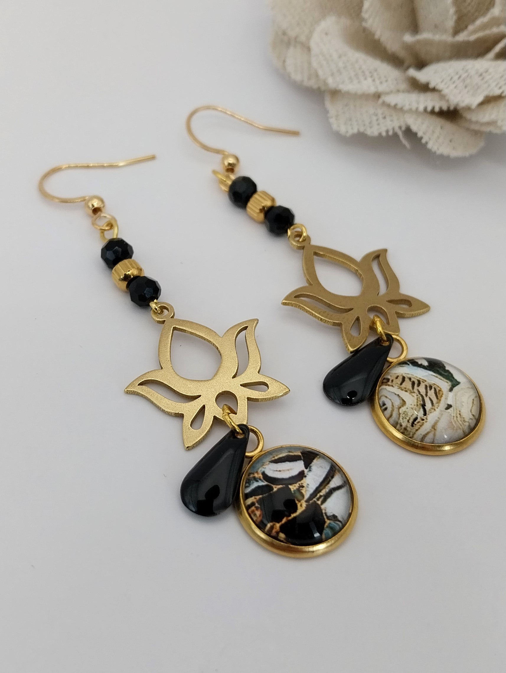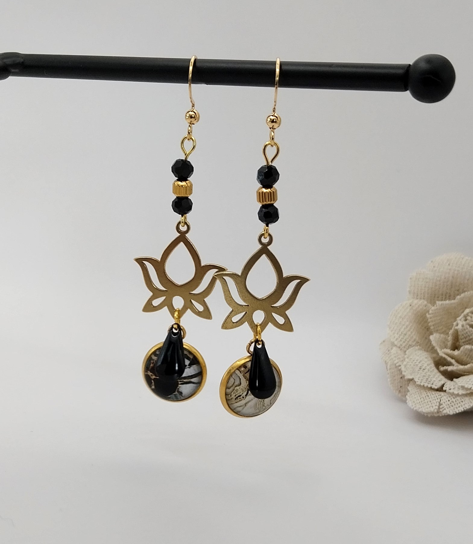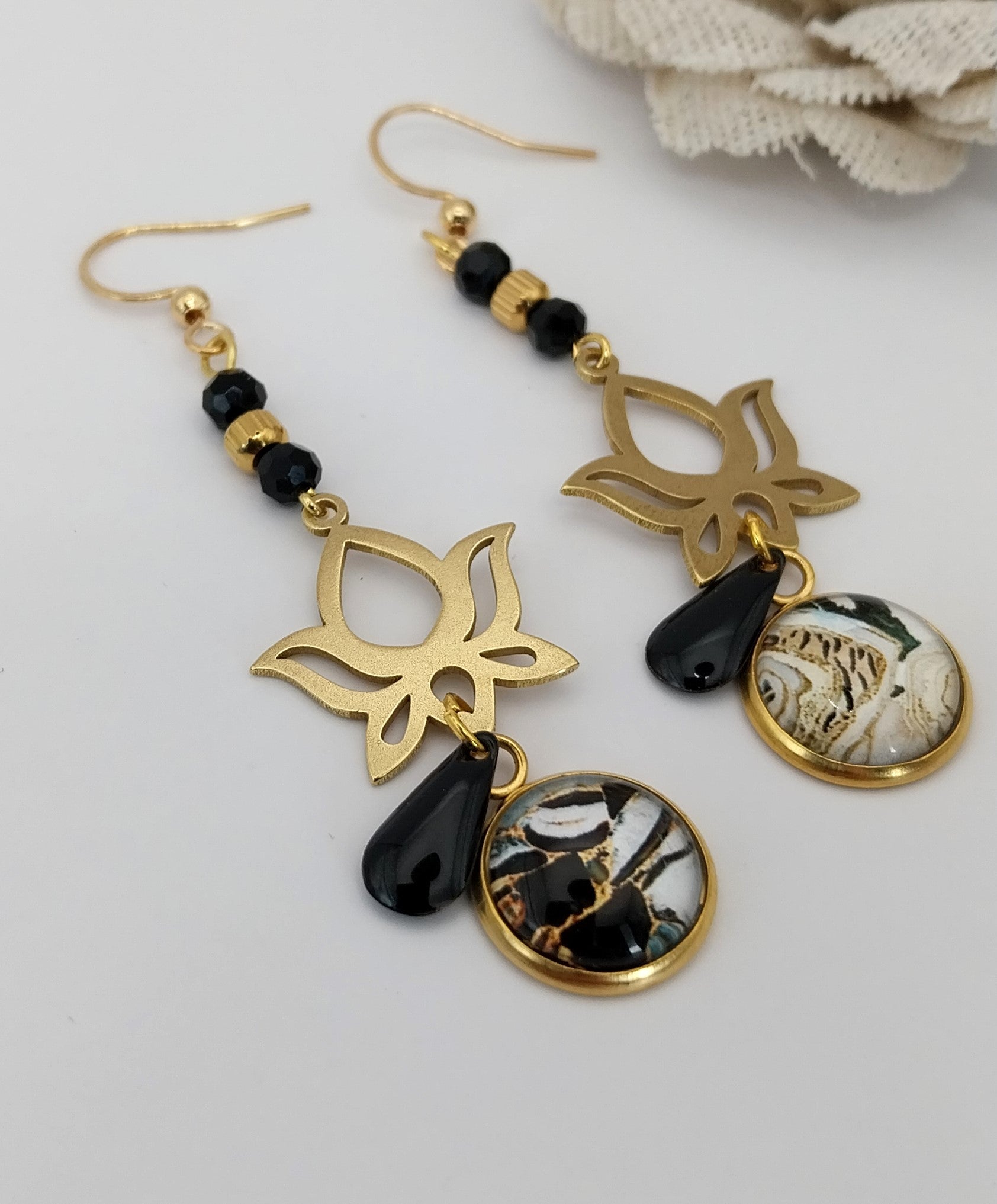 Boucles d'oreilles or et noir fleur de lotus or mat et petite breloque goutte en émail noir. Cabochons de 14 mm effet marbrés. Perles toupie et texturées.