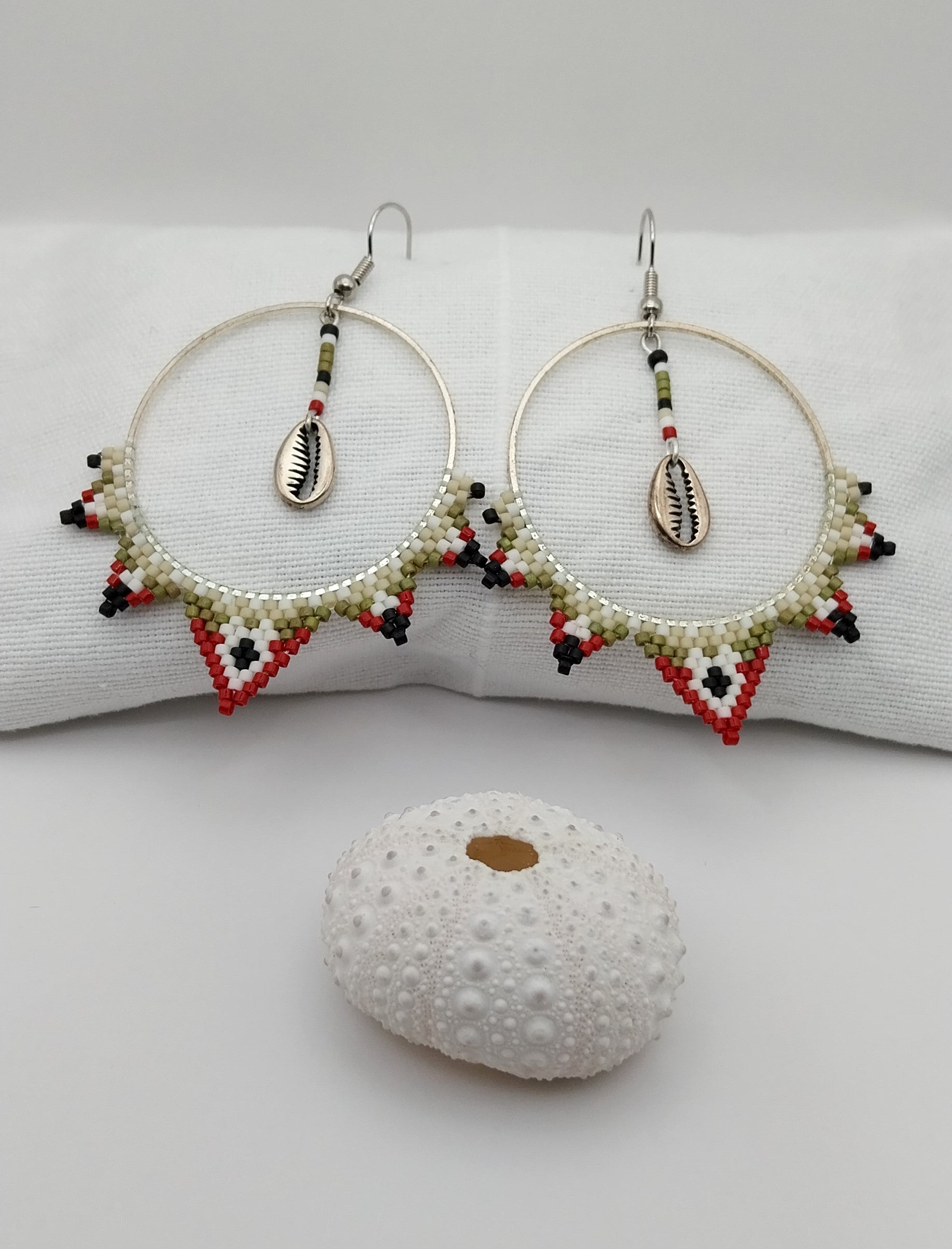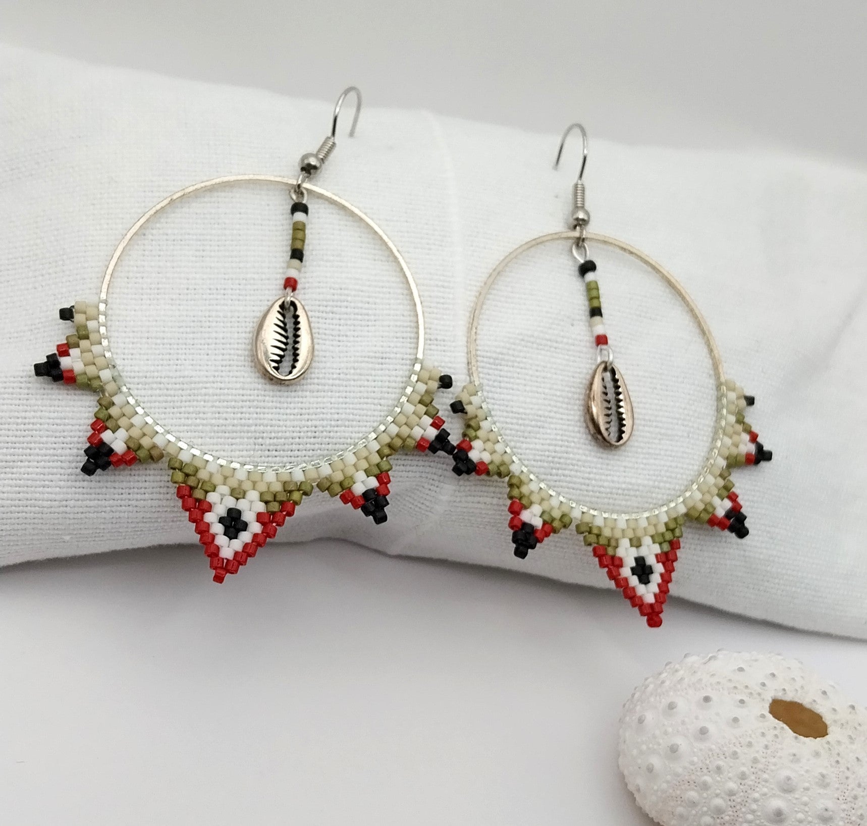 Un air de vacances pour cette paire de boucles d'oreille en perles tissées à l'aiguille. Perles de verre japonaises Miyuki. Breloque coquillage couleur argent.