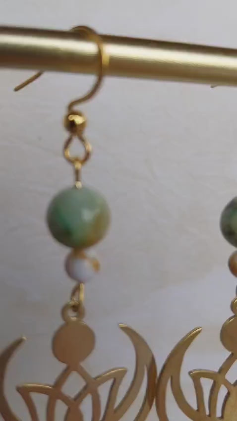 Ces boucles d'oreilles sont de couleur or et les perles en pierre marbrée sont de couleurs vertes et sable. Les breloques sont de couleur or mat.