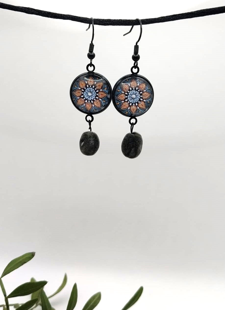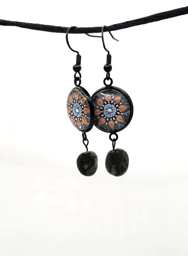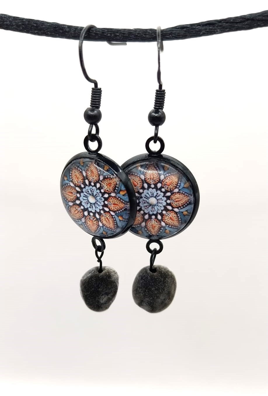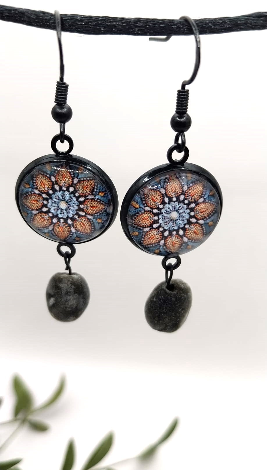 Boucles d'oreille avec cabochon en verre de 16 mm mandala. Motif bleu, noir et orangé. Breloque perles de Zanzibar. L'arbre est appelé : Majidea zangueberica ou arbre mgambo, arbre à perles noires ou arbre à graines de velours.. Ses graines sont toutes douces et reproduisent parfaitement le même effet de matière.