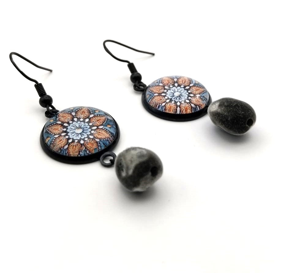 Boucles d'oreilles graines de Zanzibar et motif mandala.