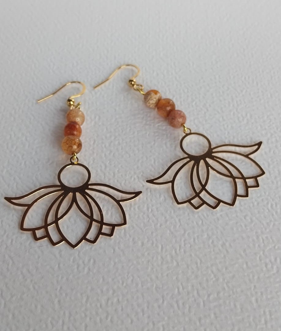 Grandes boucles d'oreilles fleur de lotus et perles veines du dragon rouge orangé.